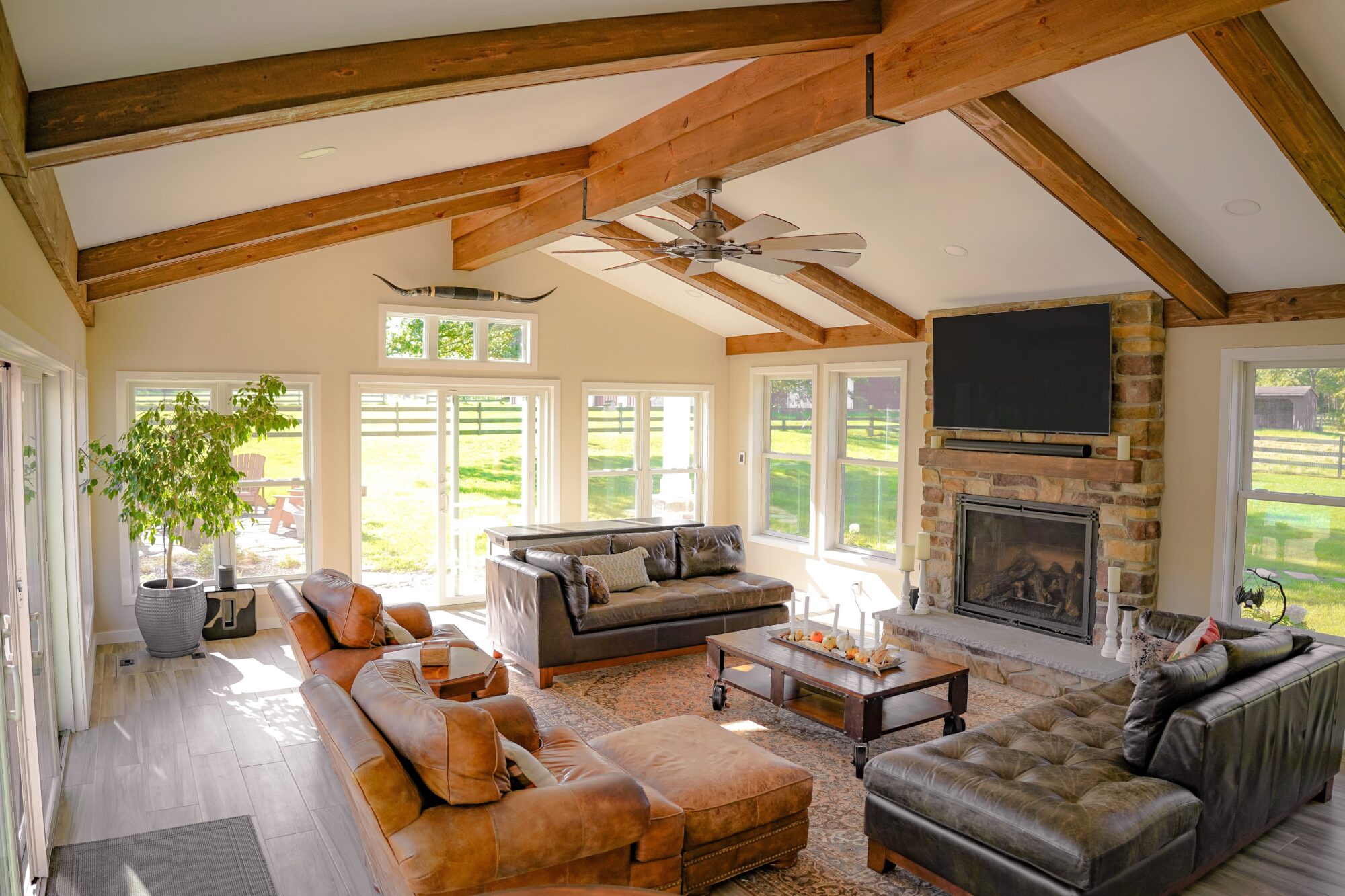 This thoughtfully designed addition transformed a traditional rancher into a more spacious and inviting home. The new great room, highlighted by a striking brick fireplace, offers a warm and welcoming atmosphere, perfect for both relaxation and entertaining. A second bathroom was added, featuring a luxurious walk-in glass tile shower, combining elegance with modern comfort. The inclusion of a sliding glass door seamlessly connects the indoors to the outdoors, flooding the space with natural light. Additionally, the kitchen underwent a stunning makeover, enhancing both its functionality and aesthetic appeal, making it a true centerpiece of the home.
